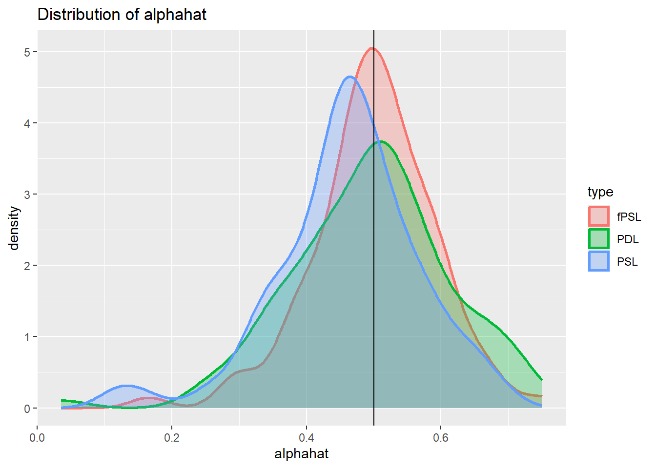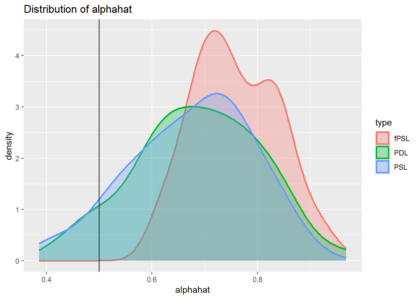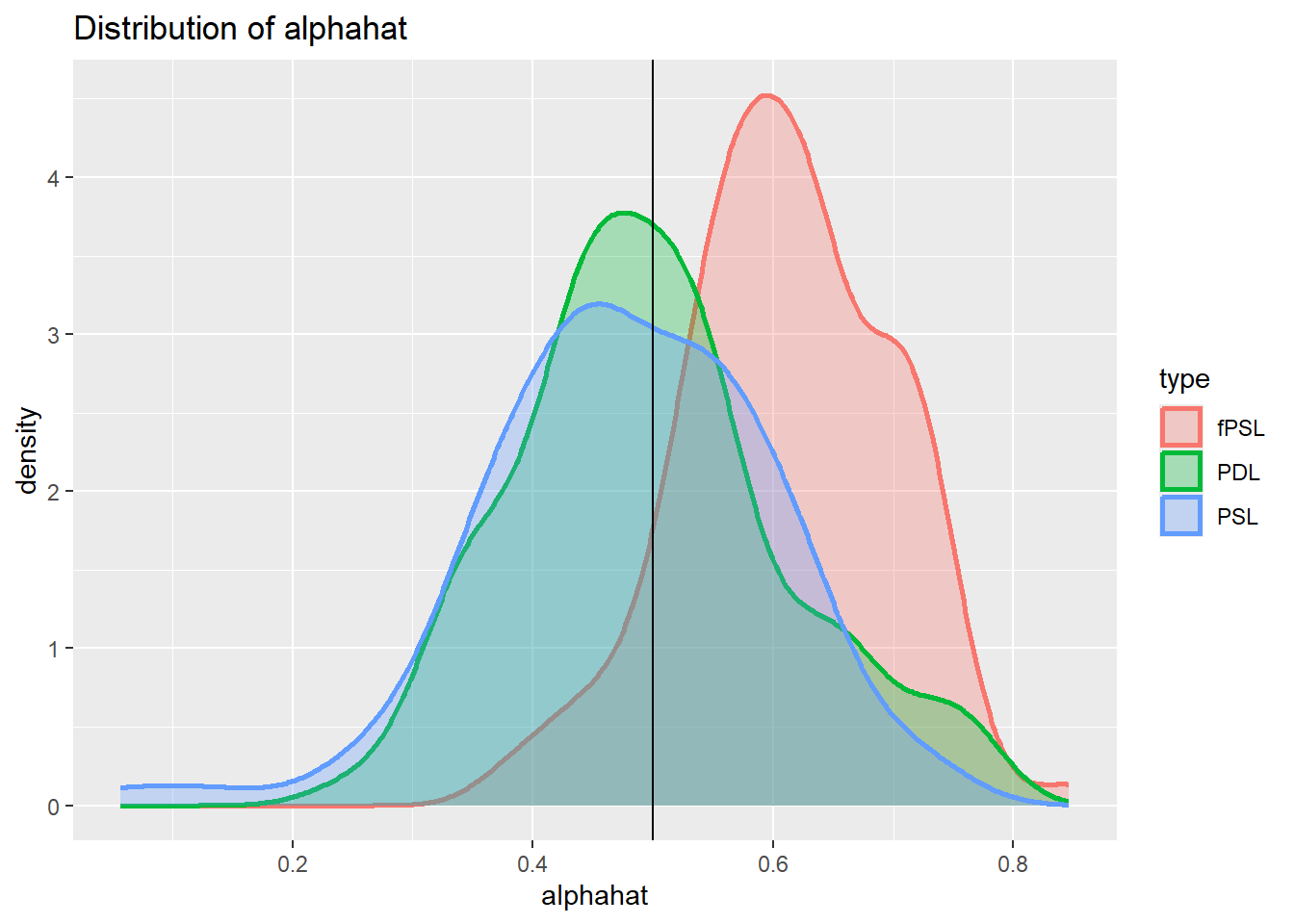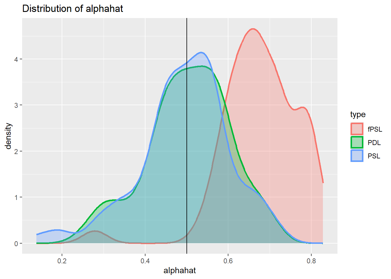 You can see from here that we get a bias in the fPSL estimator but none in the PSL and PDL estimators (the vertical line represents the true coefficient \(\alpha = 0.5\)). This mirrors the results from the Fitzgerald Sice paper, indicating that the PDL offers significant advantages to the fPSL but not to the PSL estimator.
