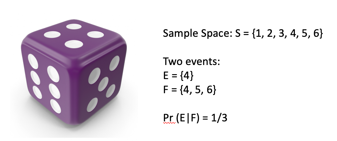 As a preliminary to the main development, consider the simple experiment of rolling a fair die and observing the number of dots on the upturned face. Then, the sample space is \(S=\left\{ 1,2,3,4,5,6\right\}\) and define events, \(E=\left\{4\right\}\) and \(F=\left\{ 4,5,6\right\}\); we are interested in \(\Pr \left(E|F\right)\). To work this out we take \(F\) as known. Given this knowledge the sample space becomes restricted to simply \(\left\{ 4,5,6\right\}\) and, given no other information, each of these three outcome remains equally likely. So the required event, \(4\), is just one of three equally likely outcomes. It therefore seems reasonable that \(\Pr (E|F)=\frac{1}{3}\).