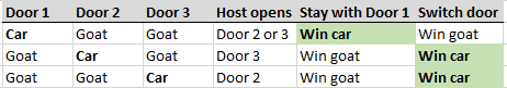 As indicated at the beginning, switching will let you win twice as often as sticking with the original choice. We now have the statistical tools to investigate why this is the case. We could use a table to explicitly list out all the possible outcomes, and count how often you get the car if you stay versus switch. Without loss of generality, suppose your selection was door 1 (This is a fancy way of saying that you can repeat the analysis assuming that you initially chose Door 2. You would find the same result; switching doubles your probability of winning). Then the possible outcomes can be seen in this table: