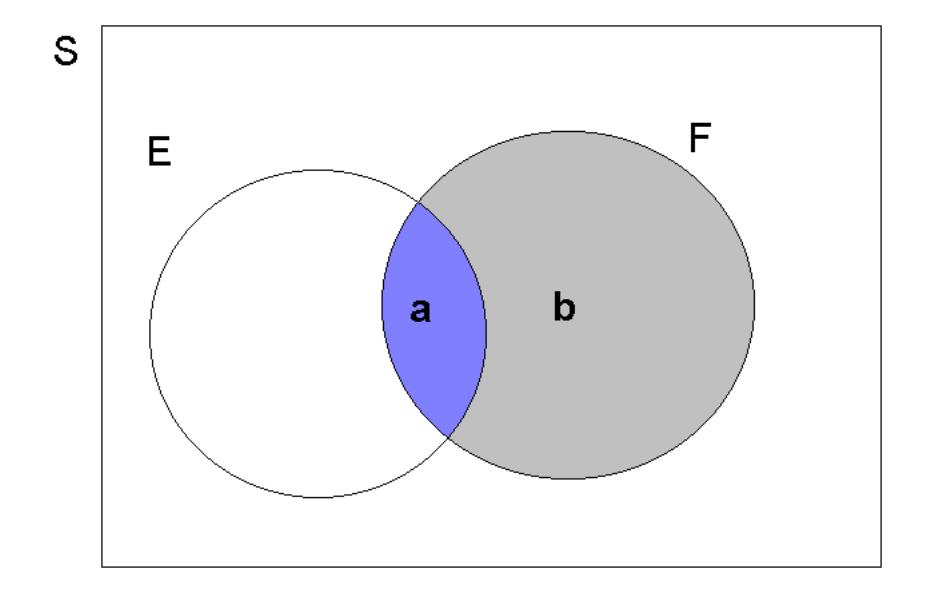 We shall now develop this idea more fully, using Venn Diagrams with the implied notion of area giving probability. Consider an abstract sample space, denoted by \(S\), with events \(E\subset S\) and \(F\subset S\). This is illustrated in the following Figure. Eventually we will want to construct the conditional probability, \(\Pr \left( E|F\right)\). Sticking with the above example that could be the probability that “you are employed at the age of 23”, given that “you have a university degree”. Two important areas used in the construction of this conditional probability are highlighted as \(\mathbf{a}\) and \(\mathbf{b}\):
