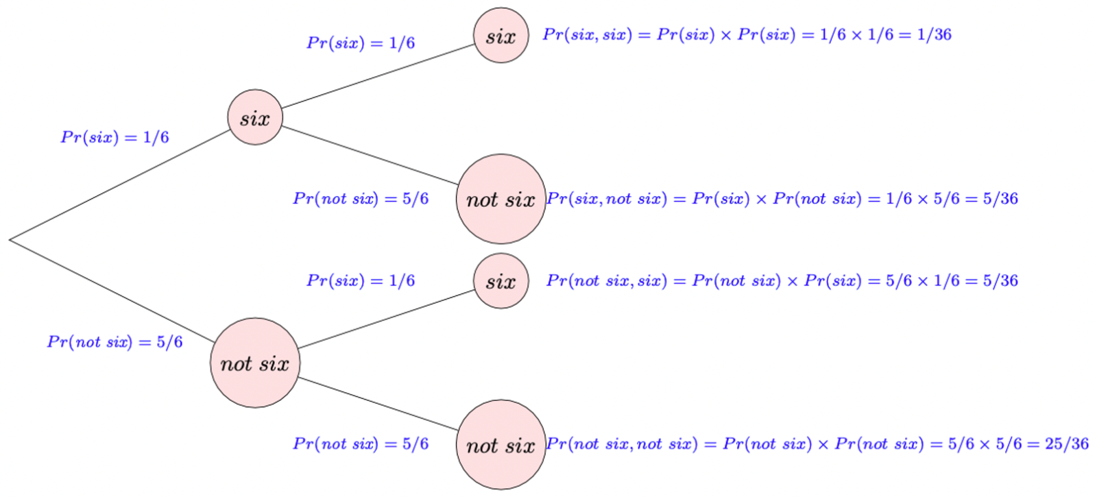 two sixes: \(P(six,six)= 1/36\)