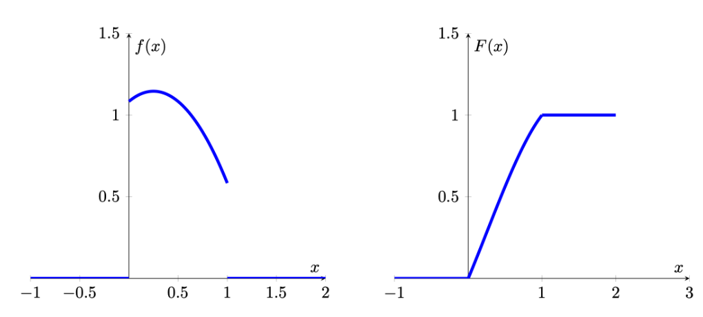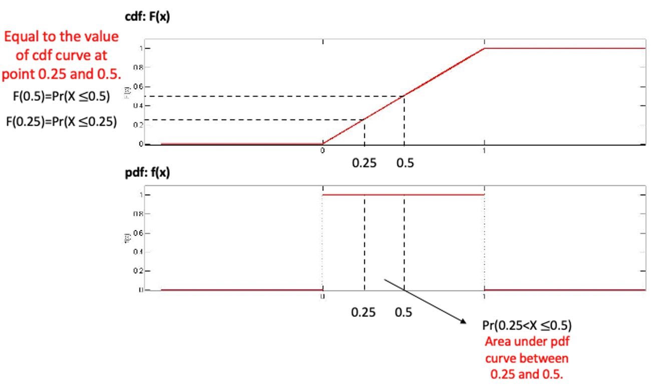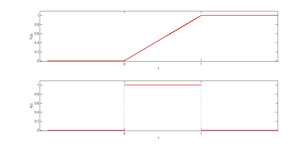 Now we will move on to another example. The following Figure gives another simple example of how the cdf and pdf are related to each other. Here probability is distributed uniformly over a finite interval (in this case, it is the unit interval \([0,1])\). Such a distribution is therefore said to be uniform and