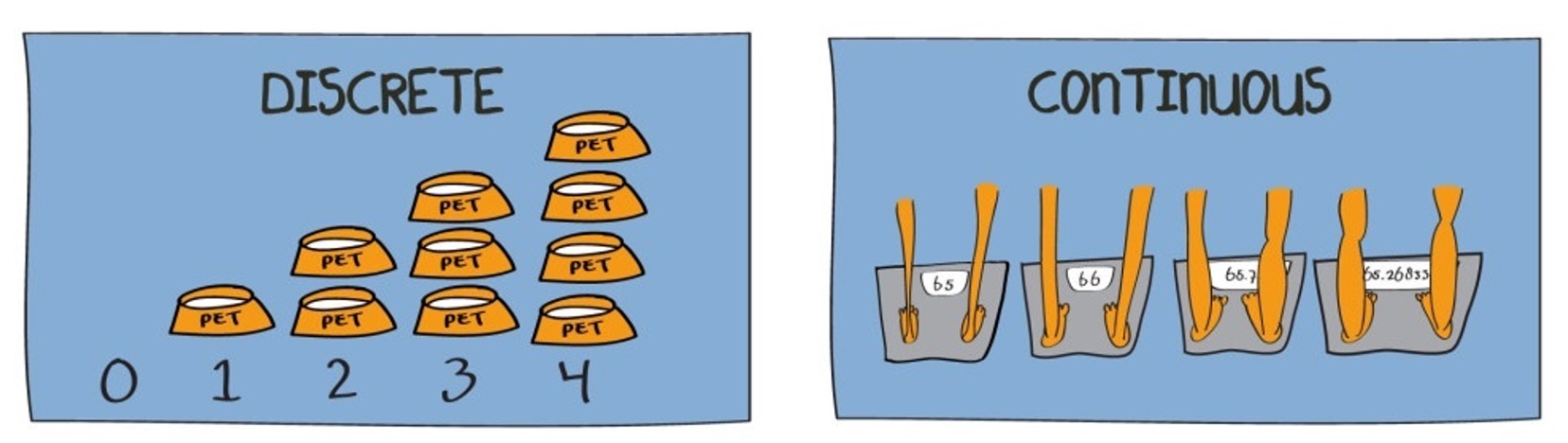 Recall that a random variable is a function applied on a sample space, by which we mean that physical attributes of a sample space are mapped (by this function) into a number. When a is applied on a sample space, this implies that the function can be applied to a continuous range of possible numbers (not just discrete numbers as with a discrete random variable). In Figure 1 you can see two random variables. The number of dogs a family owns, which can take values 0, 1, 2, 3 etc. (and hence it is a discrete variable, you cannot own 2.5 dogs). The other would be the weight of a person which can take values on a continuous scale, and not only discrete values.