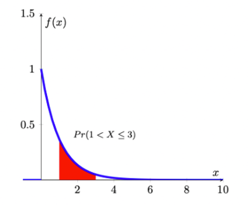 \[\begin{equation*} Pr(1<X \leq 3)= \int_{1}^{3}\exp(-x)dx = [-\exp(-x)]_{1}^{3}=exp(-1)-exp(-3)=0.318 \end{equation*}\]