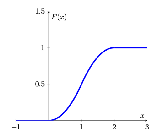 - If \(b>a\) then \(F(b)\geq F(a)\); i.e., \(F\) is increasing. In addition, over all intervals of possible outcomes for a continuous random variable, \(F(x)\) is smoothly increasing; i.e., it has no sudden jumps.