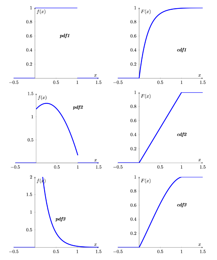 - The third is only strictly increasing over the interval \(0<x<2\), which gives the range of possible values for \(X\) in this case; here \(Pr(X\leq0)=0\), whilst \(Pr(X\geq2)=0\).