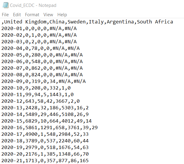 Another common file formal for spreadsheets is a “csv” file. That stands for “comma separated values”. While you can open “xlsx” files only with a spreadsheet software, the advantage of a “csv” file is that it is basically just a text file in which you can find the values of the data table. For instance the same data as in the earlier image would look like this in a “csv” file: