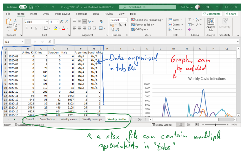 You can see that all information for any particular country is organised in one row (e.g. row 2 for Afghanistan, row 6 for Angola). All information for the same variable is presented in the same column (e.g. col D for the Land area and col F for the per capita GDP). This type of clean organisation is super important, but sometimes you will have to first do some work to get there.