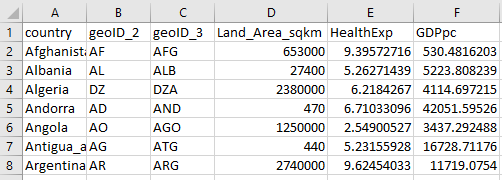 You need to think about observations (in rows) and variables (in columns). In the example you see for instance the observation for Afghanistan. For each observation we have information (variables!) on the size of the Land Area, Health Expenditure and GDP per capita. You can also see that the country information comes in three forms (three variables): “country”, “geoID_2” and “geoID_3”. The two latter are abbreviations for countries in either two or three letter codes. These are super useful as you will see in the worked example below (see IBAN codes.