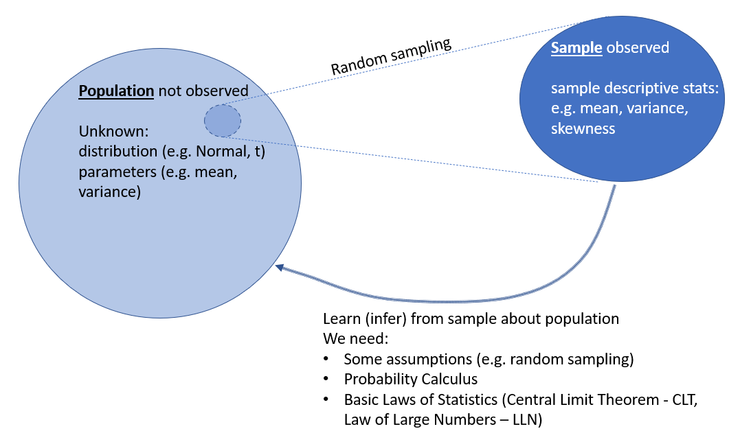 So far we have been looking at ways of summarising samples of data drawn from an underlying population of interest. Although at times tedious, all such arithmetic calculations are fairly mechanical and straightforward to apply. To remind ourselves, one of the primary reasons for wishing to summarise data is so assist in the development of inferences about the population from which the data were taken. That is to say, we would like to elicit some information about the mechanism which generated the observed data.