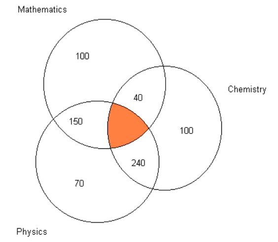 A sample of 1000 science undergraduates were asked whether they took either Mathematics (M), Physics (P) or Chemistry (C) at A-level. All of them took at least one of the three subjects at A-level. The following responses were obtained: 100 just took Mathematics; 70 just took Physics; 100 just took Chemistry; 150 took Mathematics and Physics, but not Chemistry; 40 took Mathematics and Chemistry, but not Physics; and, 240 took Physics and Chemistry, but not Mathematics. What proportion took all three?