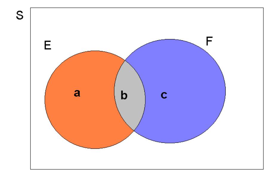 Then by Axiom 3, and from the fact that the three events $( E{F}) $, $( EF) $ and \(\left( \bar{E}\cap F\right)\) are mutually exclusive so that the “area” occupied by \(E\cup F\) is simply \(\mathbf{a+b+c}\),
