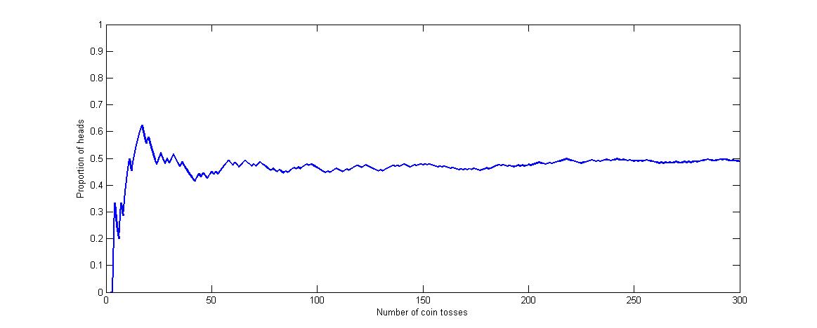This is illustrated in the next Figure where the proportion of heads obtained after \(n\) flips of a fair coin is plotted against \(n\), as \(n\) increases; e.g., of the first 100 flips, 46 were heads (\(46\%\)). Notice that the plot becomes less `wobbly’ after about \(n=140\) and appears to be settling down to the value of \(\frac{1}{2}\).