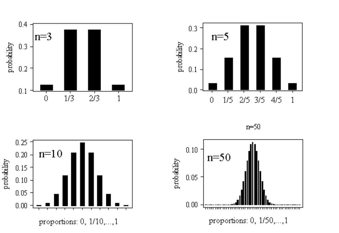 - If \(n=3\), the possible proportions could be \(0,\,\,1/3,\,\,2/3\,\,\,or \,\,\,1\)