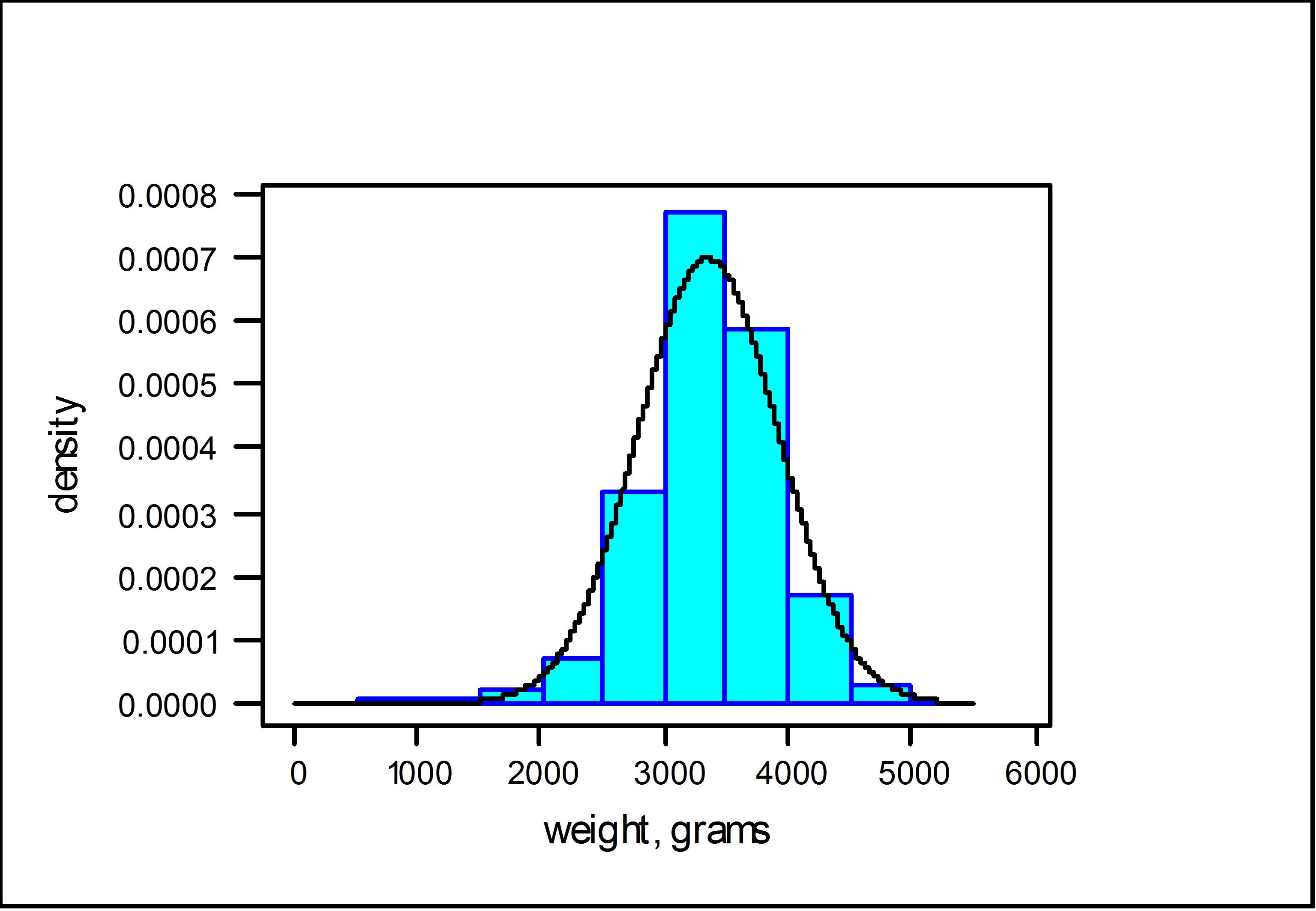 As can be seen, the fitted normal density does a reasonable job at tracing out the shape of the histogram, as constructed from the data. (I will leave it as a matter of conjecture as to whether the birth-weights of babies born to mothers who smoked are normal.) The nature of the approximation here is that areas under the histogram record the relative frequency, or proportion in the sample, of birth-weights lying in a given interval, whereas the area under the normal density, over the same interval, gives the probability.