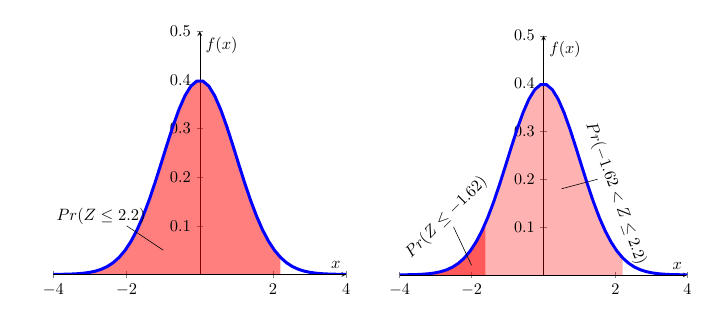 \[\begin{equation*} \Pr (-1.62 <Z\leq 2.2)=\Pr (Z\leq 2.2)-\Pr (Z\leq -1.62) \end{equation*}\]