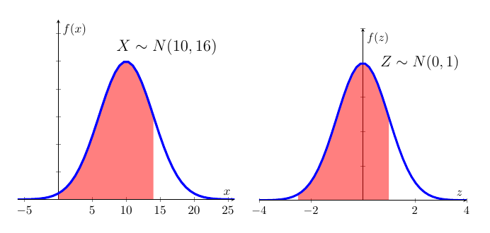 For example, if \(Z\sim N\left( 0,1\right)\), then \(X=3Z+6\sim N\left( 6,9\right)\); and, if \(X\sim N\left( 4,25\right)\), then \(Z=\frac{X-4}{5}\sim N\left( 0,1\right)\).