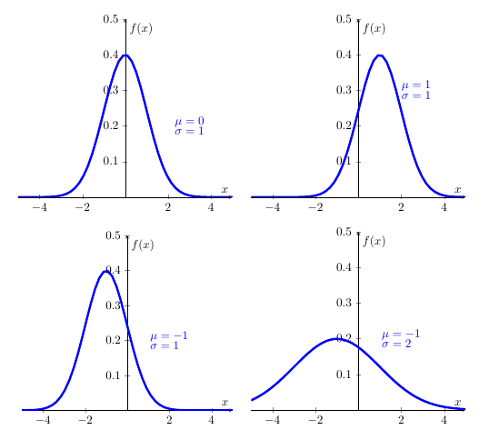 \[\begin{equation*} f(x)=\frac{1}{\sigma \sqrt{2\pi }}\exp \left( -\frac{(x-\mu )^{2}}{2\sigma ^{2}}\right) ,\quad -\infty <x<\infty ;\quad -\infty <\mu <\infty ,\,\,\,\,\sigma >0, \end{equation*}\]