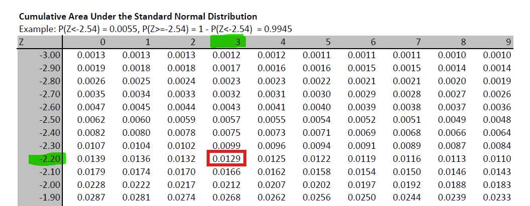 You can then see that the probability value is in the row for \(-2.20\) and the column for \(0.03\) which leads you to \(z=-2.23\), such that \(Pr(Z \leq -2.23) = 0.0129\).