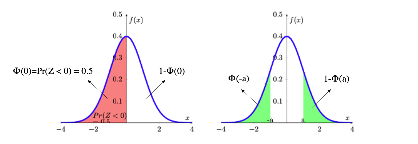 On the right hand side you can see the two highlighted (in green) areas of the distribution’s tails, \(\Phi (-a)\) and \(1-\Phi(a)\). You need to recall that \(\Phi(a)=Pr(-\infty < Z \leq a)\) and that the highlighted area in the right hand tail represents \(Pr(a < Z \leq \infty)\). As the entire area underneath the probability is 1, this implies that the area is equivalent to \(1-\Phi(a)\). Due to symmetry, both highlighted areas have the same size, say \(\Phi (-a)\) = \(1-\Phi (a)\).